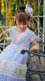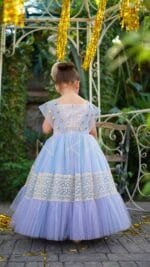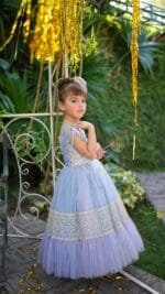 Indulge in the exquisite allure of the “Alizeh” gown. A symphony of lilac and soft blue tulle, adorned with a resplendent gold lace insert. The bodice, a canvas of gold lace and hand-embroidered sequin flowers, creates a dreamlike masterpiece. Elevate elegance with this enchanting two-tone creation.