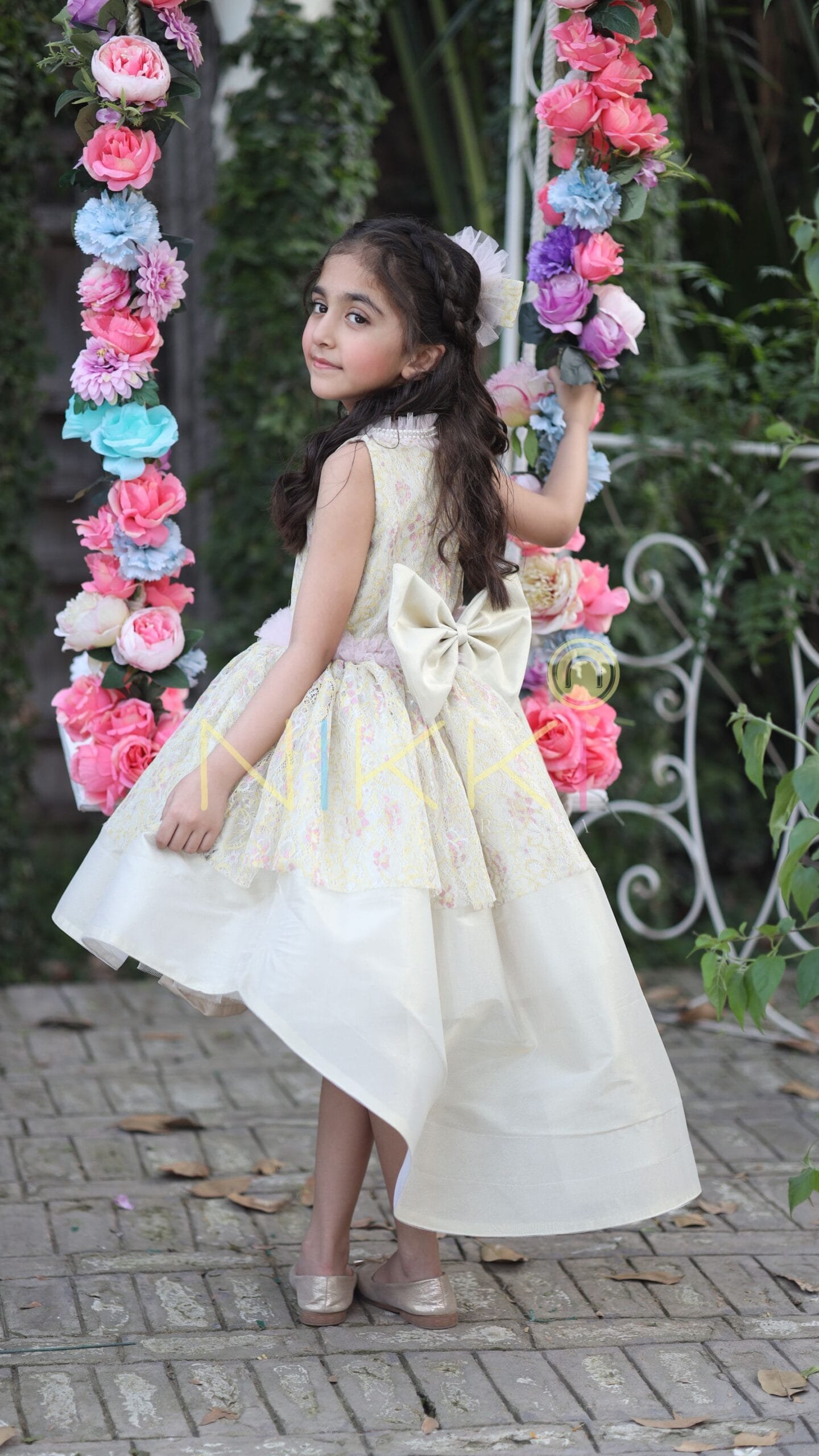 Some may call our new Andromeda dress “pretty.” But I would beg to differ. Every minute detail in the dress was inspired by by cosmic creativity. The unique hi-low style with intricately patterned lace bodice, the gold organza layered over pink tulle, the pearl embellished frills that line the neck and waist… plucked from the quiet moments between supernovas and stars. And the carefully chosen palette of soft gold and sunset pink is a pleasure to the eyes…. exquisite, yet charming. So no, pretty is far too simple a word…. Andromeda is elegant, fiery and feminine, just like its wearer.