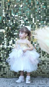 Aurelia, a dreamy shimmer moonlight dress with a graceful circular skirt and handmade floral sleeve details. Designed to sparkle with every twirl, it’s perfect for celebrations, parties, and magical moments. ✨