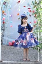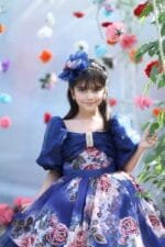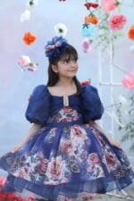 Azure Bloom, a midnight’s embrace, whispers of dreams and watercolor grace. Dark blue enchantment, a floral affair, Puff sleeves dancing with ethereal flair. A party frock, a magical sight, Where little hearts shine, their dreams taking flight.