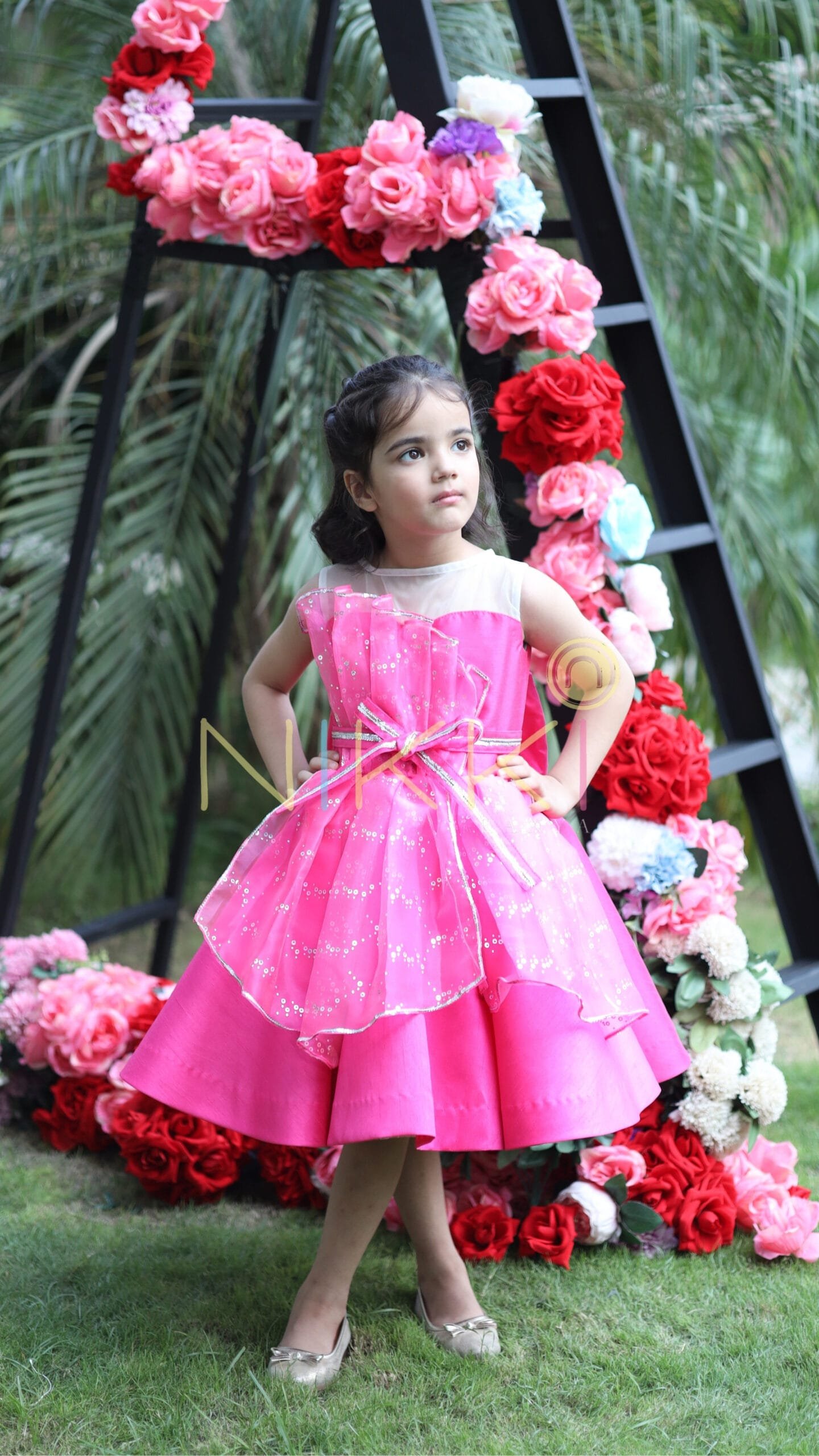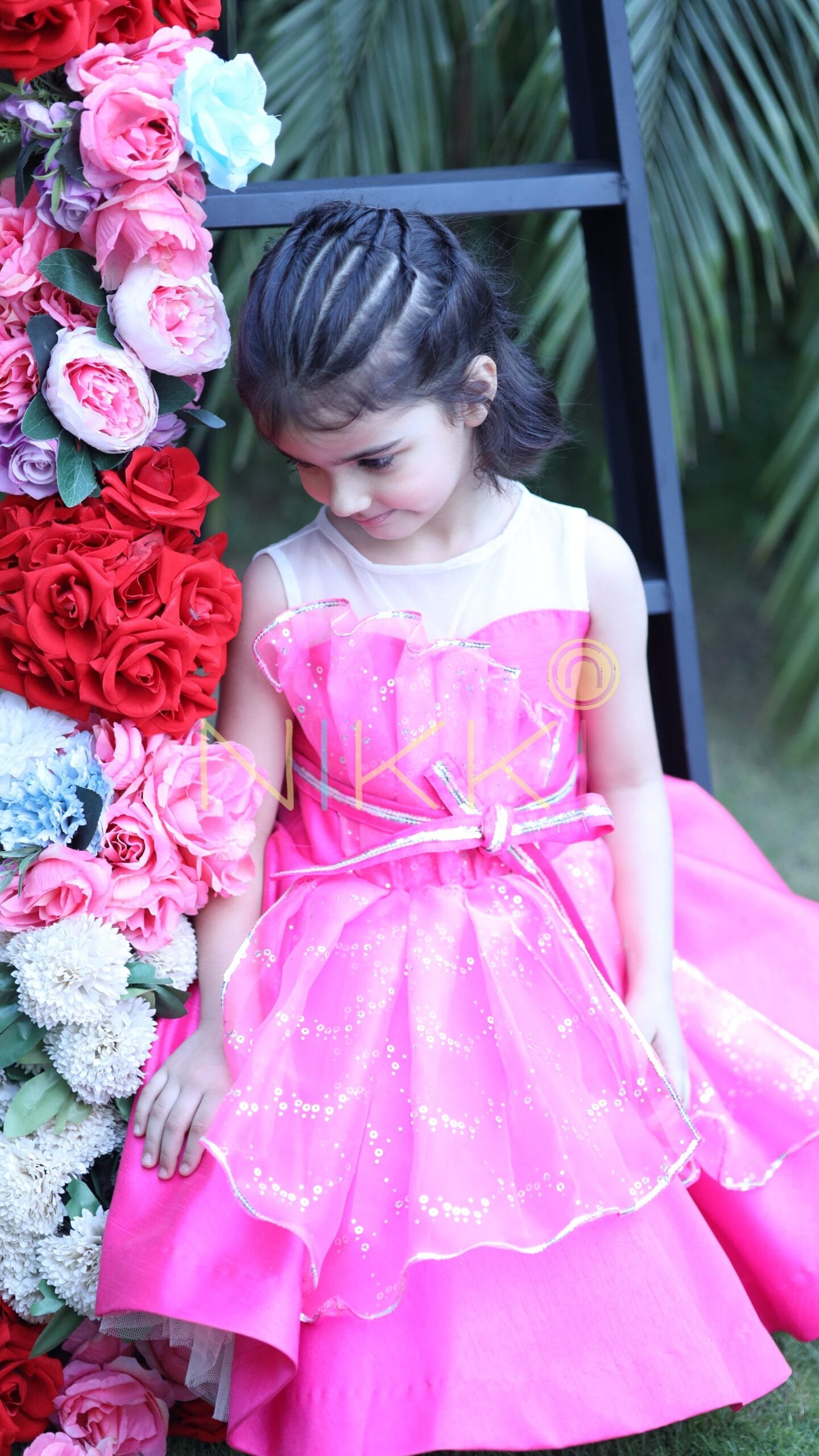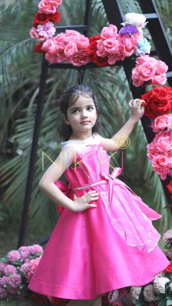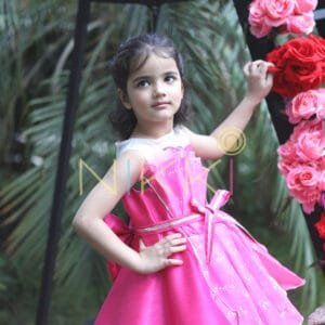 A design right out of a girl’s dream! All pink, glittery and ribbons? Yes, but more so, it’s bold, chic and stylish! A dress that looks so charming that its creation is a closely guarded secret at our workshop. The body is bubblegum pink silk with an asymmetric, embellished organza panels that’s reminiscent of the silver foil inside a candy wrap. A bedazzled silver and pink ribbon belt around the waist adds an extra fun flair. Satisfy your sweet tooth with our new