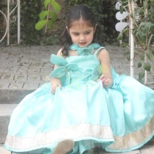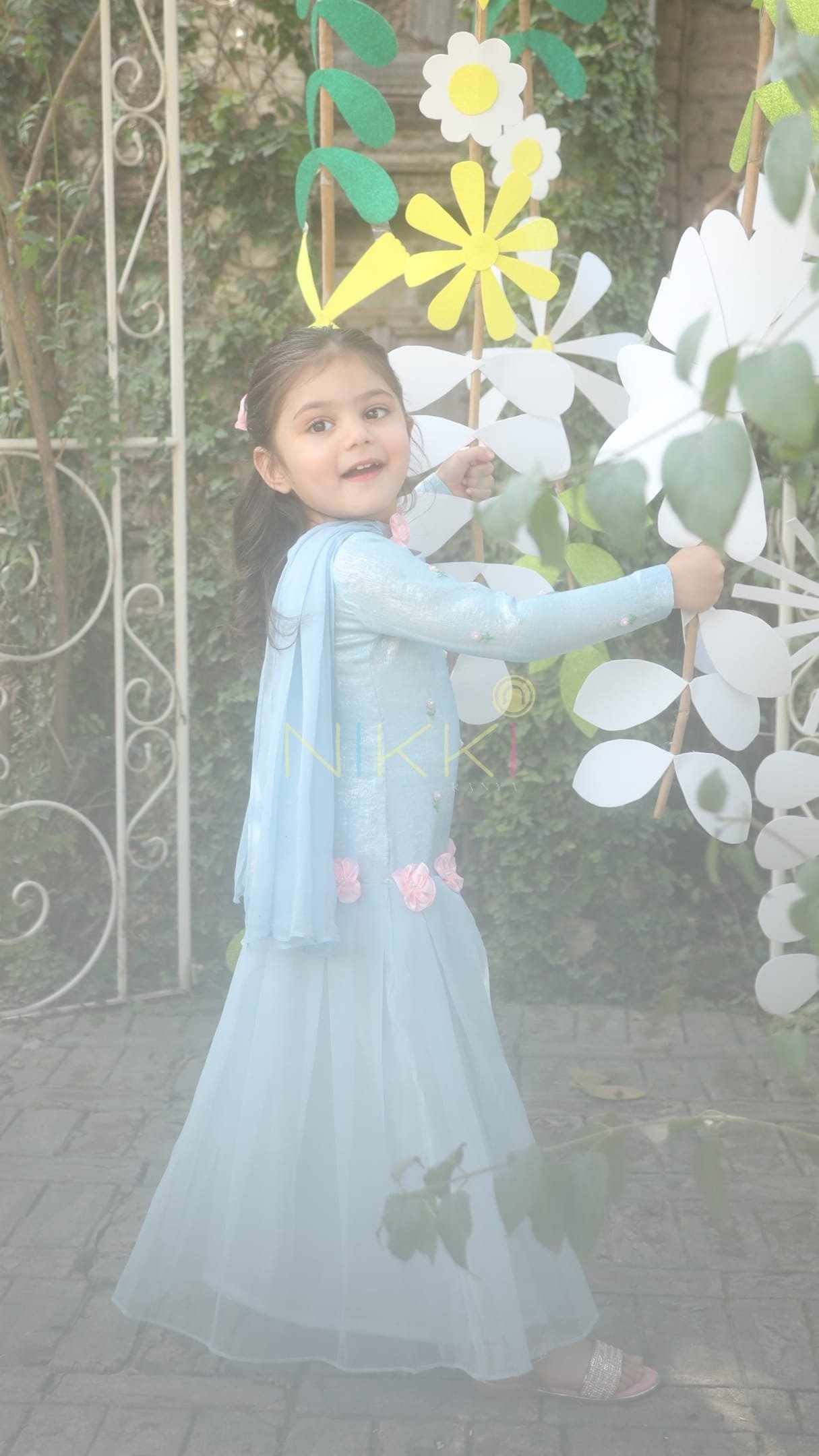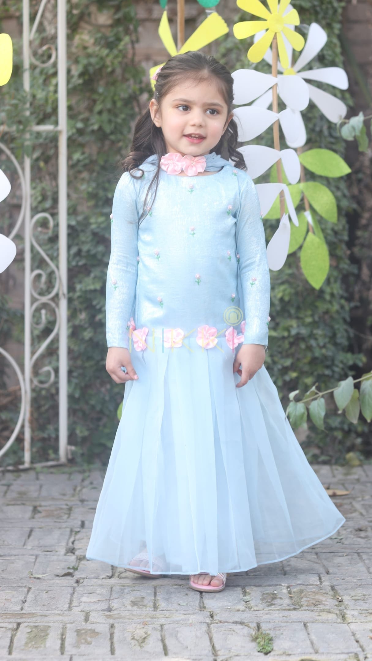 Husna is a dreamy shimmery silk and tissue dress, delicately hand-embellished with floral detailing on the bodice and sleeves. Finished with a graceful row of handcrafted flowers, it’s designed to shimmer softly and bloom with timeless elegance.