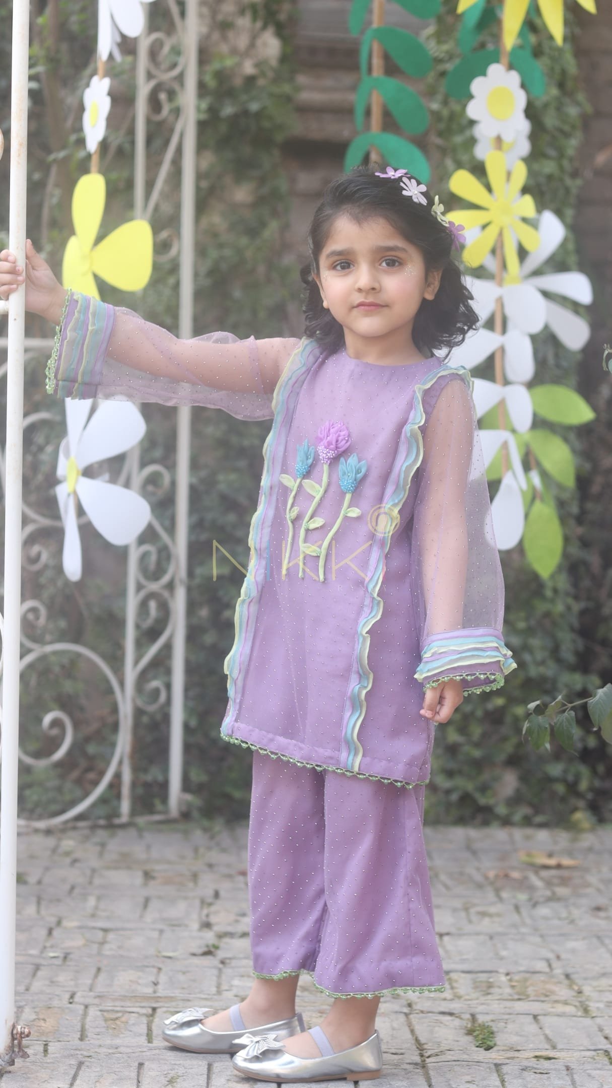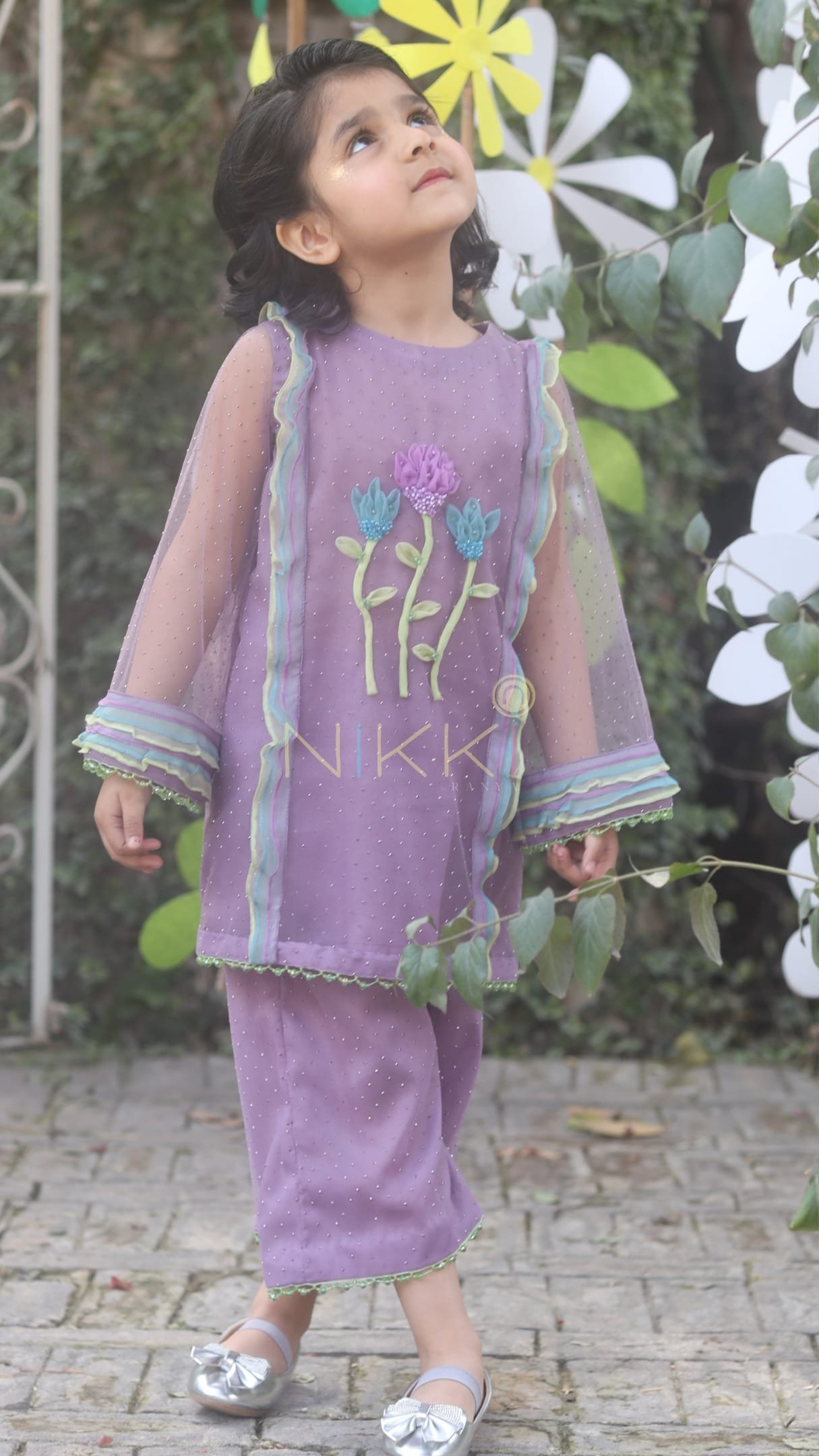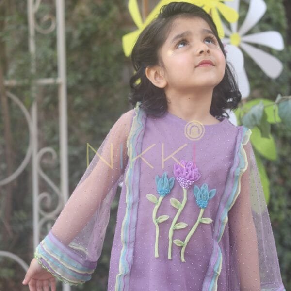 Lalezar is a charming soft-purple tulle co-ord set, delicately finished with a subtle diamanté spray. Accented with beaded green trim and adorned with handcrafted floral detailing on the front, it’s a graceful blend of whimsy and elegance.