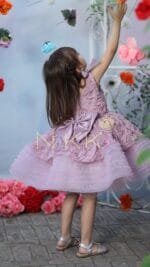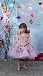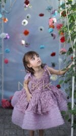 Lovelace in lilac, a masterpiece of elegance. Adorned with delicate bows gracing each shoulder, it exudes a touch of playfulness. The skirt, adorned with a wide border of tulle frills, invites graceful twirls. A dress that weaves dreams into reality, capturing hearts with its timeless charm.
