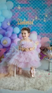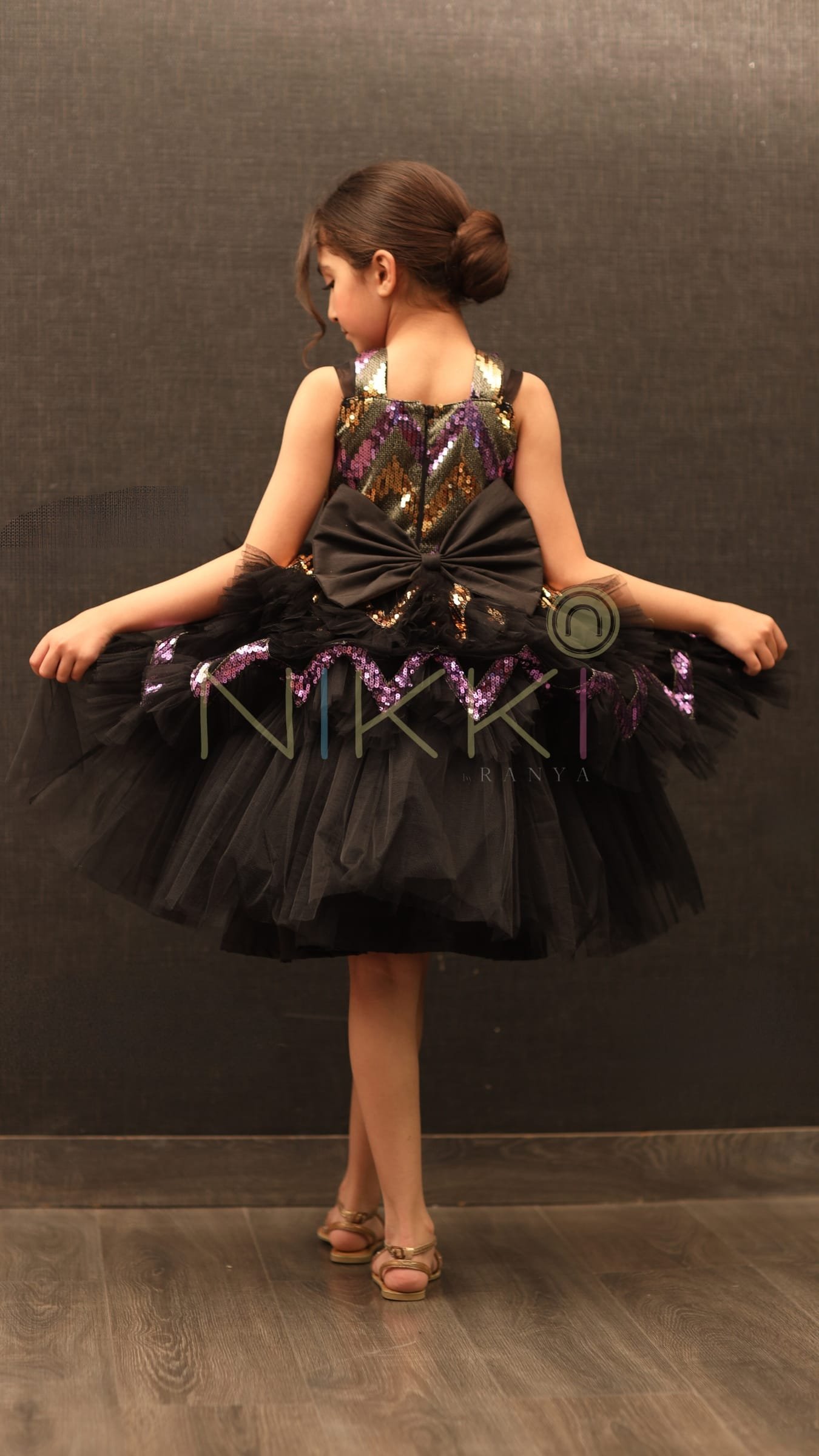 Introducing the ‘Misoni’, a chic masterpiece in black with a dazzling chevron sequin bodice. The playful chevron frill, adorned with purple and golden sequins, adds a touch of magic. Elevate her style with this enchanting dress that combines elegance and sparkle.