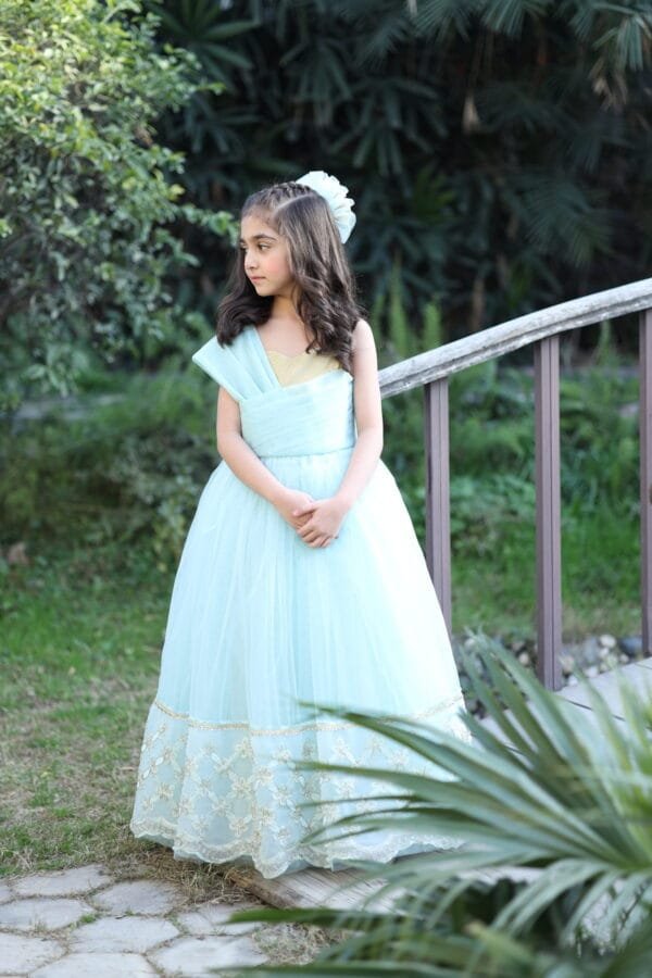 Like a deer prancing through moonlit snow, the Selene dress personifies understated elegance and tranquil beauty. A sleeveless glittery gold bodice is overlayed with pleated powder blue tulle, a unique creation, reminiscent of nobility of old. Add a tulle skirt with flower and filigree lace details on the hem, and you have a divine design like no other!