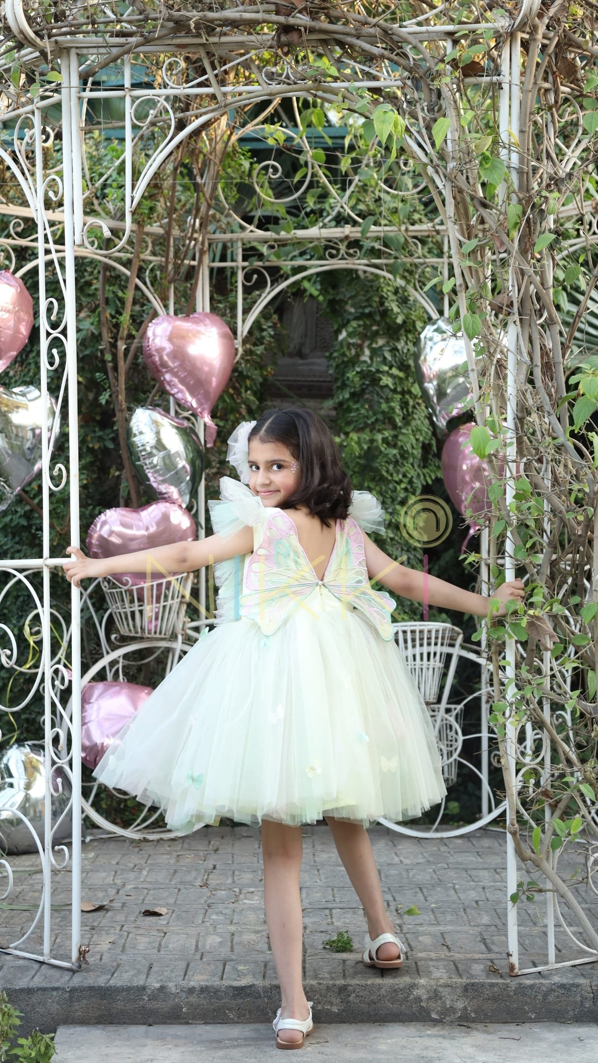 The Tinkerbell dress enchants with soft green tulle, knee-length elegance, and a frilled bodice. Adorned with silk butterflies and a delicate embroidered butterfly at the back, it’s pure fairy-tale charm for every little dreamer.